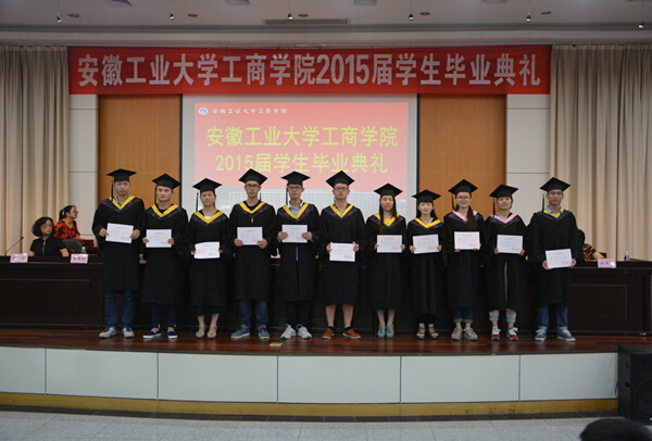 学生工作处处长祝红宣读了2015年“安徽省普通高等学校品学兼优毕业生”和“安徽工业大学工商学院优秀毕业生”等有关表彰文件。院领导依次为获奖学生颁发了荣誉证书,为各系毕业生代表颁发了毕业证书和学位证书。
