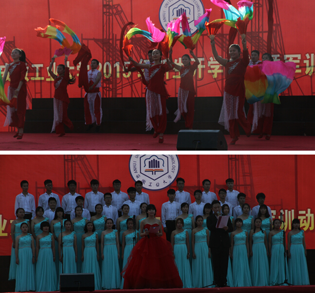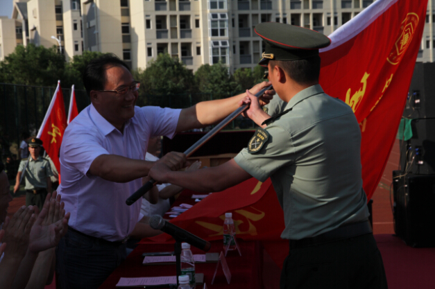 本次军训全体新生组成了一个军训师,下属3个军训团,会上,军训师师长以及3个军训团团长分别从校党委书记刘新跃手中接过了师、团旗。