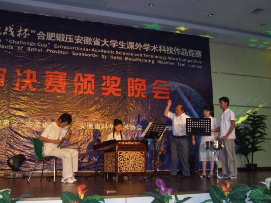 5月30晚,终审决赛颁奖典礼在我校学术会议中心隆重举行,历时几个月的第二届“挑战杯”合肥锻压安徽省大学生课外学术科技作品竞赛圆满落下帷幕。担任本次竞赛终审决赛的各位专家评委,各参赛高校师生共300多人参加颁奖典礼。团省委书记王宏,马鞍山市市长姚玉舟、团省委副书记张永,省科协副主席程荣朝,合肥锻压集团董事长严建文,我校党委书记李辉生、校长岑豫皖、党委副书记邢琅、副校长林钟高出席典礼,并为大赛获奖团体和团队颁奖。岑豫皖校长代表学校在颁奖典礼上致辞。我校师生在颁奖典礼上奉献了一台精彩的文艺演出。团省委、省教育厅、省科协、省学联有关部门负责同志也出席了典礼并观看了演出。安徽卫视、新安晚报和马鞍山市各媒体现场对大赛进行了报道。