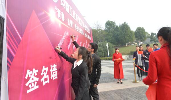表彰大会前,全体获奖学生代表在新大学生活动中心外的签名墙上签名留念,展示了我校学子们的蓬勃朝气和青春风采。表彰会上,计算机科学与技术学院学生李云龙、机械工程学院学生罗杰、商学院学生李逊超分别代表获奖学生发言。