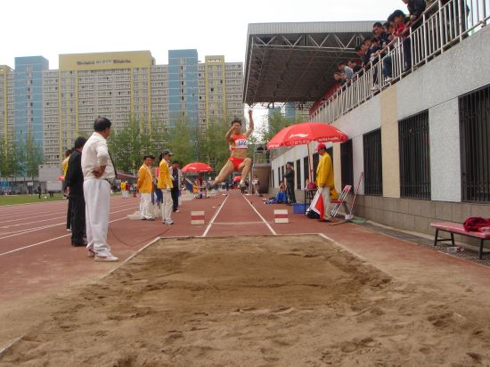 世界大学生运动会中国大学生田径选拔赛于2007年4月21日在北京科技大学举行,我校陈亚玲同学以6米30的成绩获得第一名。下图为陈亚玲同学的比赛现场。