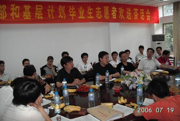 7月19日下午,我校隆重举行2006年大学生志愿服务西部计划和安徽基层计划毕业生志愿者欢送茶话会。校党委副书记邢琅、副校长李家新,校党委宣传部、学工部、教务处、财务处、就业指导中心、校团委及有关学院负责人,与今年即将奔赴新疆、重庆、安徽金寨的40名志愿者欢聚一堂,畅谈大学生活、师生之情,寄语服务西部和基层的希望。