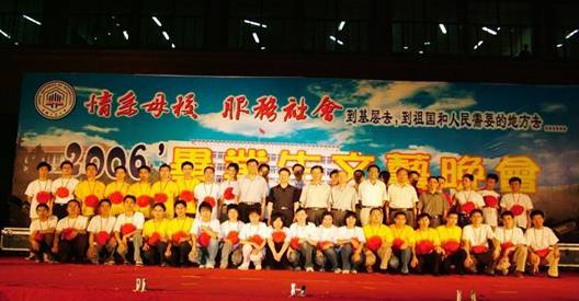 此前,我校曾在2006届毕业生离校文艺晚会上,40名毕业生志愿者在《到西部去》的乐曲声中胸带大红花走上舞台,面对全校师生集体庄严宣誓志愿者誓词。学校还为志愿者们颁发了奖金。