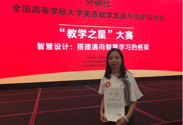 8月4日,2017年外研社“教学之星”大赛复赛第六期在成都举行,40名参赛教师同台竞技,精彩纷呈。我校外国语学院大学英语教学部教师吴然菊过关斩将,荣获复赛亚军,这是我校自参加外研社“教学之星”大赛以来取得的最好成绩。