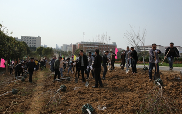 阳春三月,春暖花开。327日下午,秀山校区冶材化楼南侧上坡空地上旌旗招展,人头攒动。校领导刘新跃、魏先文、祖明、林钟高、葛芦生、顾明言和机关各部门(单位)干部职工,一起参加义务植树活动。
