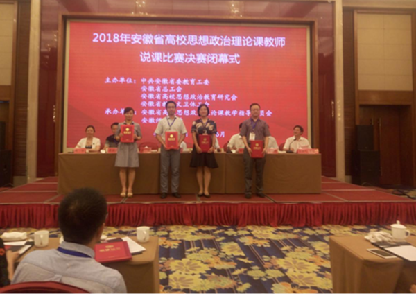 6月26日,由安徽省委教育工委、安徽省总工会和安徽省高校思想政治教育研究会主办,安徽师范大学承办的2018年安徽省高校思想政治理论课教师说课比赛决赛在安徽师范大学举行,来自全省30名选手参加了本次决赛。经过激烈角逐,我校马克思主义学院的汪宏老师、陆春晖老师分别荣获一等奖和三等奖。