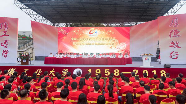 初秋的校园,香樟含笑,丹桂飘香。9月17日下午,我校2018年新生开学典礼暨建校60周年系列活动启动仪式在佳山校区体育场隆重举行。1985届自动化专业校友、马钢(集团)控股有限公司总经理、马钢股份有限公司董事长丁毅,校领导刘新跃、魏先文、祖明、林钟高,见证学校60年发展历程的老教师代表,校党委常委,各学院党委书记、院长,新生军训承训教官,教师代表,在校生代表以及2018级全体新同学参加了典礼仪式。典礼由副校长祖明主持。