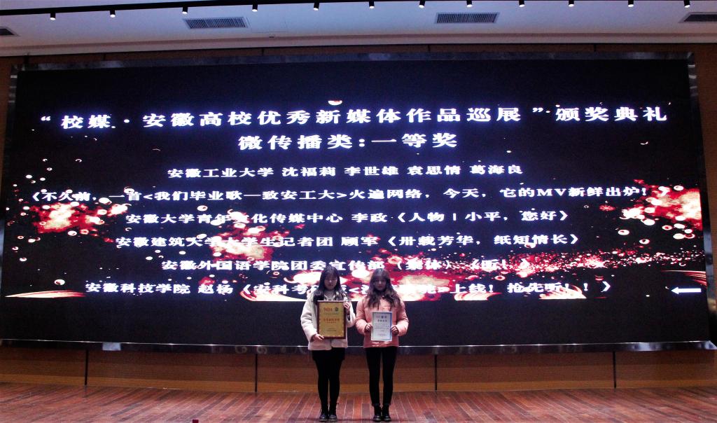 12月31日,中国(安徽)高校传媒联盟2018年度评比结果揭晓,我校4件新媒体作品在近百幅作品中脱颖而出,获一等奖1项,三等奖3项;校新媒体中心获“十佳会员媒体”称号,并在颁奖典礼上作典型发言。