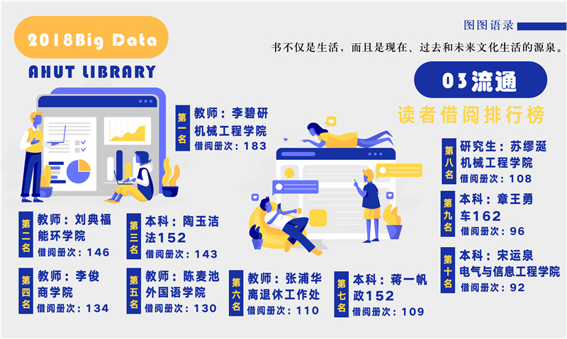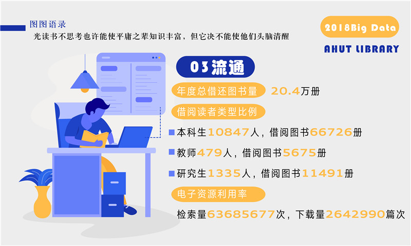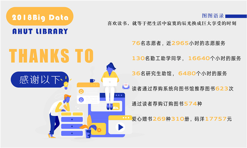 图书馆近日发布2018年度大数据,以图文方式直观形象地展示了图书馆一年来的人气、资源、读者服务、阅读推广、信息素养教育等整体状况。此次是图书馆连续第四次发布年度大数据。