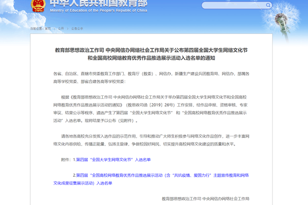 据悉,第四届“全国大学生网络文化节”和“全国高校网络教育优秀作品推选展示活动”由教育部思想政治工作司、中央网信办网络社会工作局主办,以“礼赞新中国,奋进新时代,争做好网民”为主题,全国共征集作品29032件。其中,“全国大学生网络文化节”面向高等院校全日制在校学生征集微电影、动漫、摄影等9类作品;“全国高校网络教育优秀作品推选展示活动”面向高等院校教师征集优秀网络文章、优秀“微”作品、优秀工作案例等3类作品。活动旨在推动广大师生积极参与网络文化作品创作生产,扩大高校网络文化影响力,不断强化守正创新,增强新时代高校思想政治工作的吸引力和实效性。