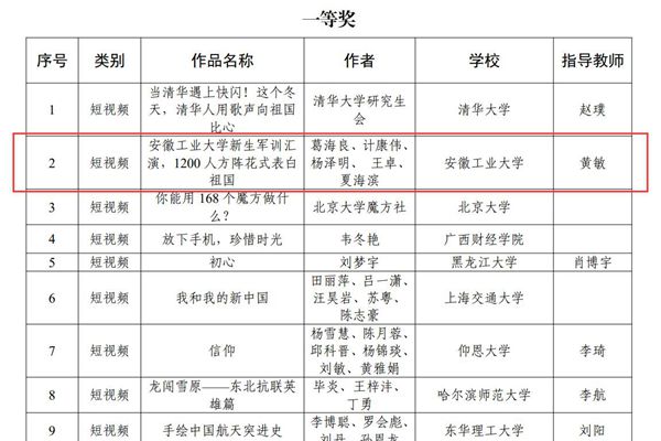 我校报送的作品“安徽工业大学新生军训汇演,1200人方阵花式表白祖国”获短视频类一等奖,该作品通过多架无人机对2019级新生军训成果汇报暨总结表彰大会上的方阵表演进行了组合航拍,从高空视角呈现了“祝福祖国”方阵演绎的“祖国万岁”“1949-2019”“I❤安工大”等图案,视频一经推出,即被《中国青年报》微博、中国青年网、安徽省教育厅微博等网络媒体转发,当天各平台累计播放量超10万,受到网友广泛好评。我校报送的作品《安徽工业大学“三走进”网络文化中心》荣获工作案例类优秀奖,该工作案例系统总结了我校“三走进”网络文化中心以“走进师生的思想,走进师生的学习,走进师生的生活”的“三走进”为工作思路,通过不断完善网络文化作品的生产机制、打造立体多元的网络文化平台、创新网络文化作品的呈现形式等工作,显著提升学校网络文化育人效果的工作经验。