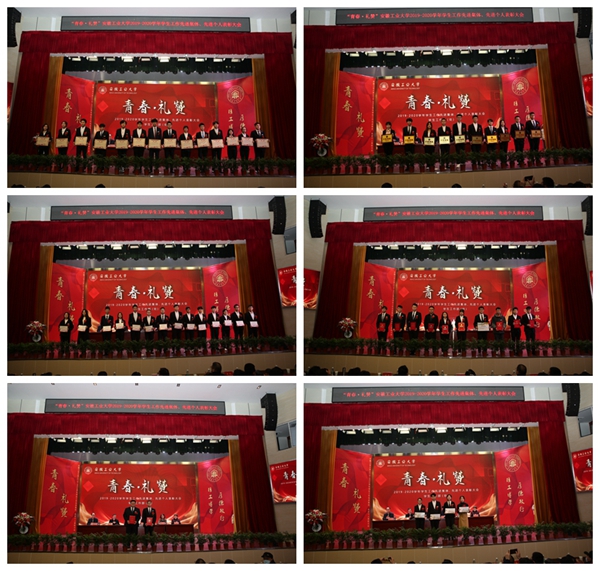 会上,祖明宣读了学校2019-2020学年学生工作表彰决定。校领导为获得校暑期社会实践优秀团队、校“十佳班级”、校“三好学生标兵”、校第九届自强之星和2019年度“中国大学生自强之星”、校“青年五四奖章”(学生)、宝钢优秀学生奖学金、国家励志奖学金、国家奖学金、第九届“挑战杯”安徽省大学生创业计划竞赛金奖、2020年大学生学科和技能竞赛A类赛事国家一等奖等十大类奖项的先进集体、先进个人代表颁发奖牌、证书。