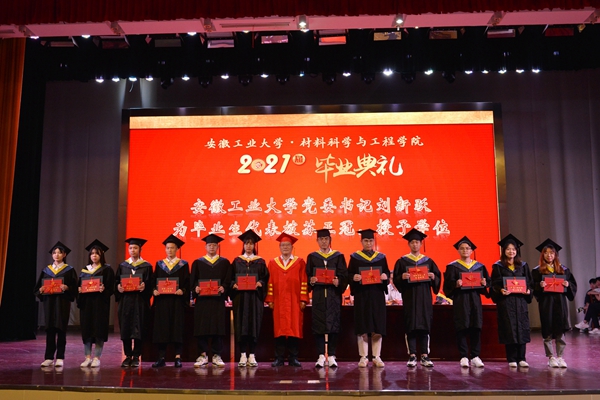 毕业生怀着激动的心情依序上台,刘新跃和学院教授委员会代表为毕业生拨苏正冠、颁发毕业证和学位证,并与他们合影留恋。毕业生代表、在校生代表、教师代表依次发言。参加典礼的领导老师还为毕业生颁发了安徽省普通高等学校优秀毕业生、校优秀毕业生荣誉证书和校友联络员聘书。