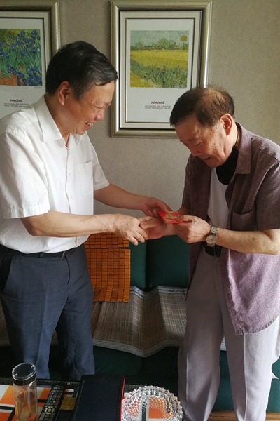 魏先文来到退休老领导邢善所家中,与他亲切交谈,为他颁发了“光荣在党50年”纪念章,送上节日慰问和诚挚祝福。邢善所表示,纪念章凝聚着党组织对他们的关怀,他将始终坚守初心,永远听党话、跟党走,发挥余热做贡献,并祝愿学校发展越来越好。