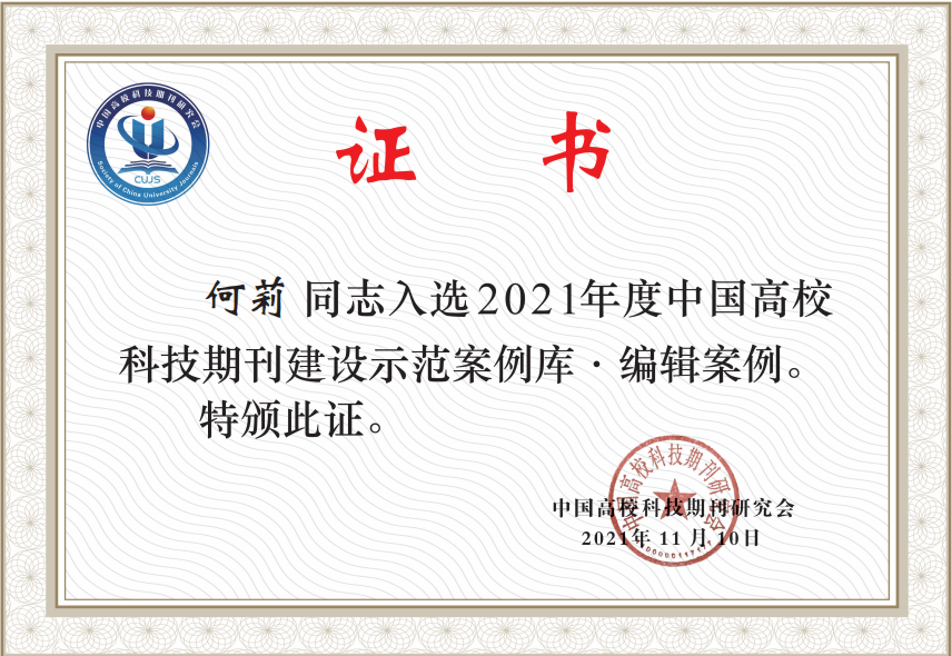 近日,中国高校科技期刊研究会第25次学术年会顺利召开,大会公布了“2021年度中国高校科技期刊建设示范案例库•编辑团队及编辑个人案例”入选结果。我校学报编辑部教师何莉提交的编辑案例成功入选“2021年度中国高校科技期刊建设示范案例库·编辑案例”。