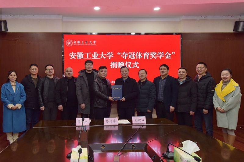 祖明代表学校向安徽夺冠体育科技有限公司颁发了捐赠证书。管理科学与工程学院党委书记汪春胜与陈志栋代表双方签订了《安徽工业大学教育发展基金会接受捐赠协议》。