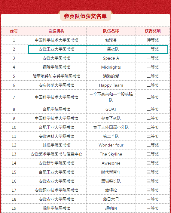 本次大赛由安徽省高等学校图书馆情报工作委员会、安徽省高校数字图书馆主办,以“声扬家国梦,建功新时代”为主题,初赛、复赛采用网络在线形式,总决赛采用现场表演形式。来自全省55所高校1082支团队的3787名选手参赛,最终19支团队晋级总决赛。在总决赛中,我校选手整体配合稳定、个人发挥出色,以电影《金陵十三钗》中南京大屠杀片段为配音素材,精彩演绎了战争的残酷和各界人士同仇敌忾的勇气决心,最终斩获佳绩。