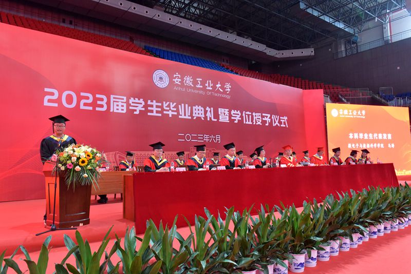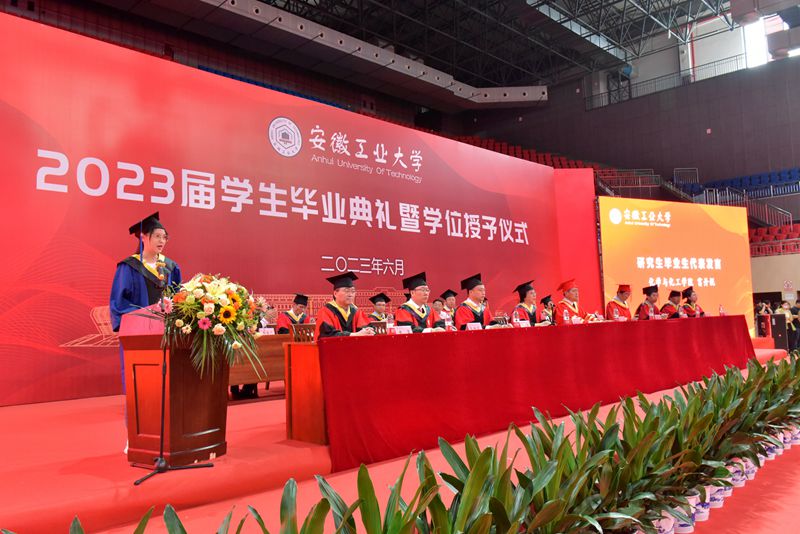 魏先文代表学校向圆满完成学业的毕业生们表示祝贺,对辛勤付出的全体教职工表示感谢。魏先文回顾了冶金、材料、化工、微数学院在学风创优、科技创新、社会实践中取得的突出成绩,对2023届毕业生涌现出的先进集体和个人表示表扬。他以“矢志奋斗,终身进取,在中国式现代化新征程上绽放青春风采”为题,寄语毕业生要担当使命,拼搏进取,不辜负党的期望和人民期待,始终将聪明才智贯穿于学业全过程、融入到事业追求中,兢兢业业做好每一项工作,精益求精做好每一件事情,将安工大人的家国情怀和历史担当,浓墨重彩地写进中国式现代化的壮丽篇章;要终身学习,守正创新,树立终身学习的理念,学会运用习近平新时代中国特色社会主义思想的世界观和方法论,深刻领会“六个必须坚持”,把握工业发展规律,成长为一专多能的复合型人才;要心怀敬畏,明德修身,坚定正确的世界观、人生观、价值观,践行社会主义核心价值观,坚守内心的道德底线,言有所戒、行有所止、心有所畏,谦卑待人,谨慎处事,在中国式现代化建设新征程上谱写青春华美乐章。