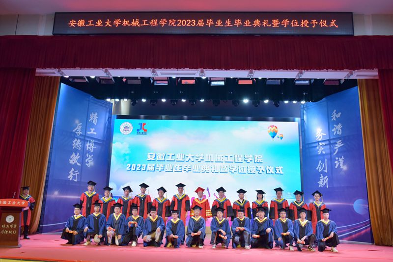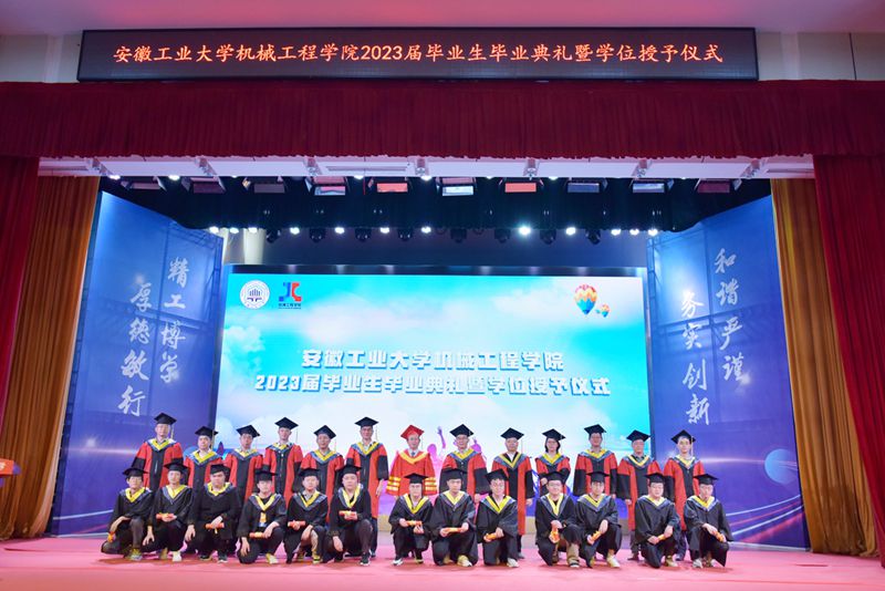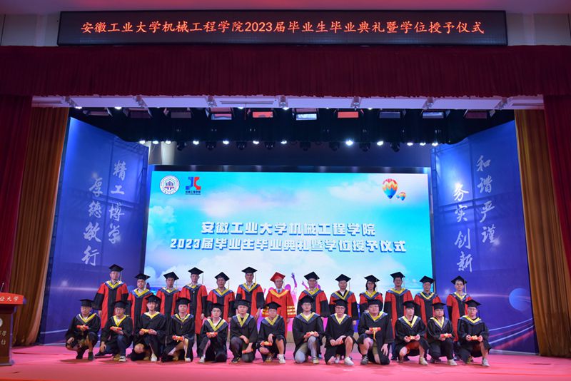 在学位授予仪式上,机械工程学院院长刘庆运宣读了《关于授予2023届机械工程学院本科毕业生工学学士学位的决定》、《关于授予2023届机械工程学院研究生毕业生工学硕士学位的决定》。毕业生们身着学士服依次走上学位授予台,领导嘉宾为每位毕业生扶苏正冠,颁发毕业证书、学位证书,并合影留念。