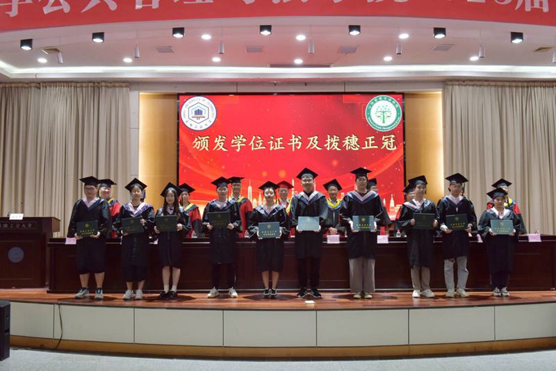 学位授予仪式上,在主席台就座的领导老师为2023届毕业生扶苏正冠,颁发毕业证书、学位证书,并合影留念。