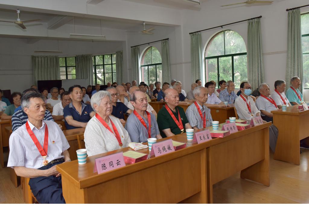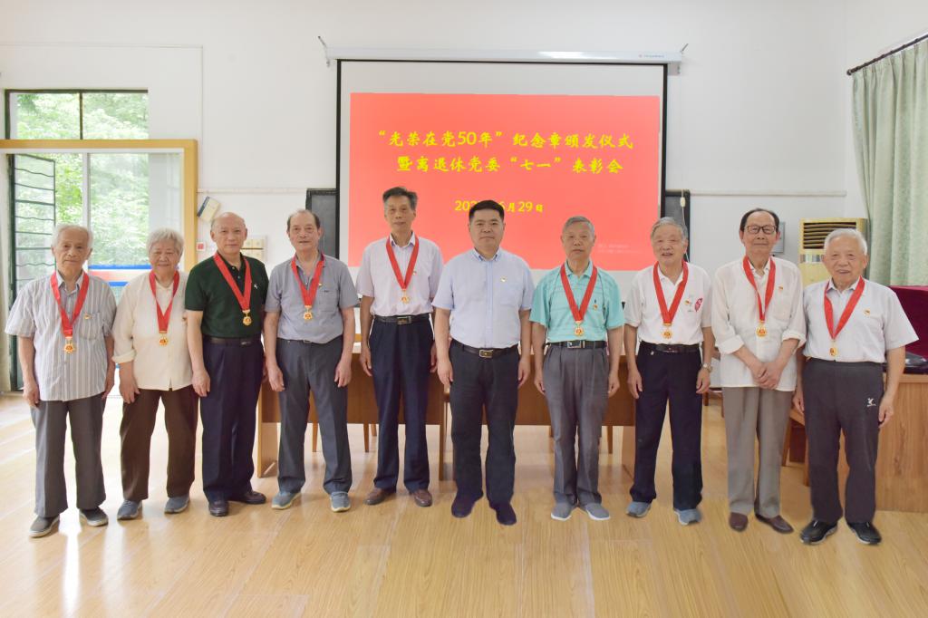 在庆祝中国共产党成立102周年来临之际,6月29日下午,我校举行“光荣在党50年”纪念章颁发仪式暨离退休党委“七一”表彰会。校党委书记陆林出席,校党委常委、组织部部长赵保平,离退休党委负责人、离退休党员和在职党员参加。