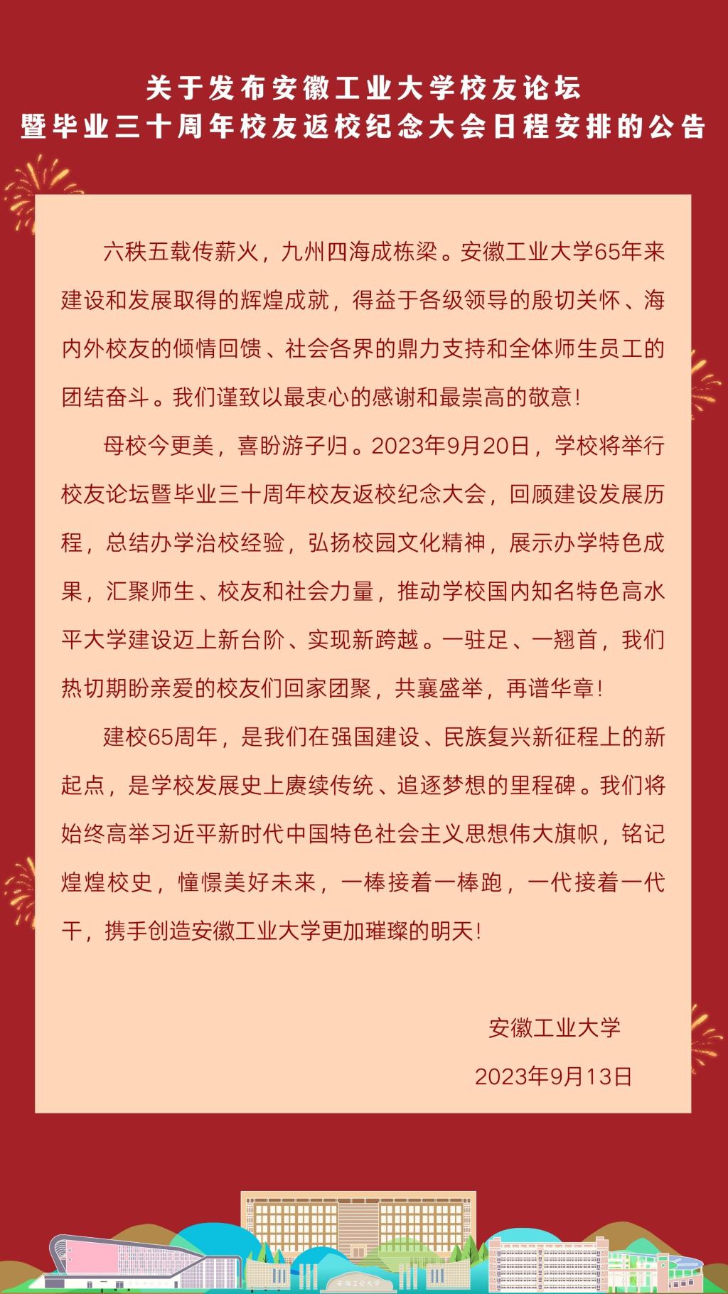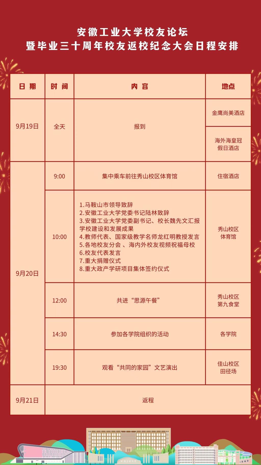【六五芳华 弦歌不辍】关于发布安徽工业大学校友论坛暨毕业三十周年校友返校纪念大会日程安排的公告