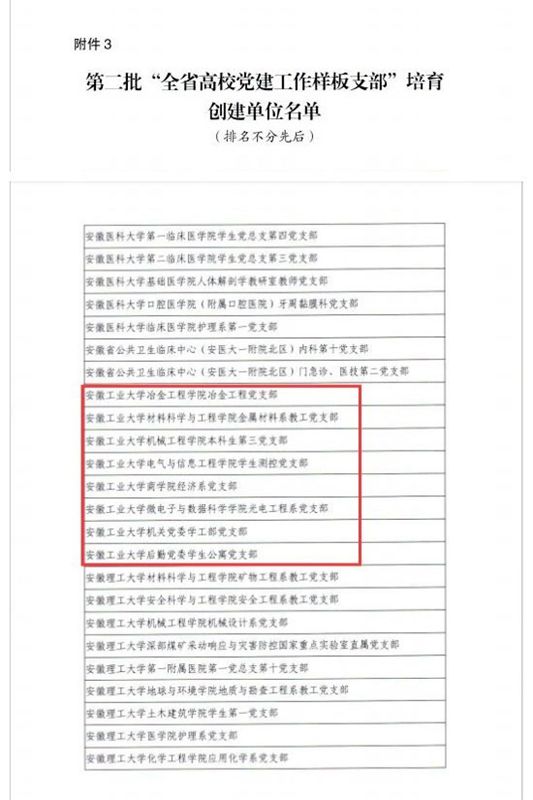 建筑工程学院党委入选全省“标杆院系”培育创建单位;冶金工程学院冶金工程党支部等8个党支部入选全省“样板支部”培育创建单位;冶金工程学院冶金工程博士研究生党支部、2名研究生党员分别入选全省“研究生样板党支部”和“研究生党员标兵”创建名单。