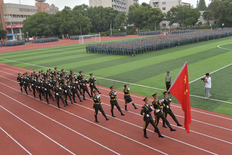 大会在雄壮的国歌声中开始。参训新生分别进行了队列训练和特色课目成果汇报。在鲜艳的五星红旗指引下,英姿飒爽的校国旗护卫队带领14支学院方队,迈着铿锵有力的步伐依次通过主席台接受检阅,他们士气高昂、军姿挺拔、口号嘹亮,赢得了在场师生的阵阵掌声。特色方队分别展示了匕首操、擒敌拳、女子格斗、战术和战场救护等训练成果。同学们还用整齐的队列在崭新的绿茵场上拼出“65”字样,表达对建校六十五周年的深深祝福。