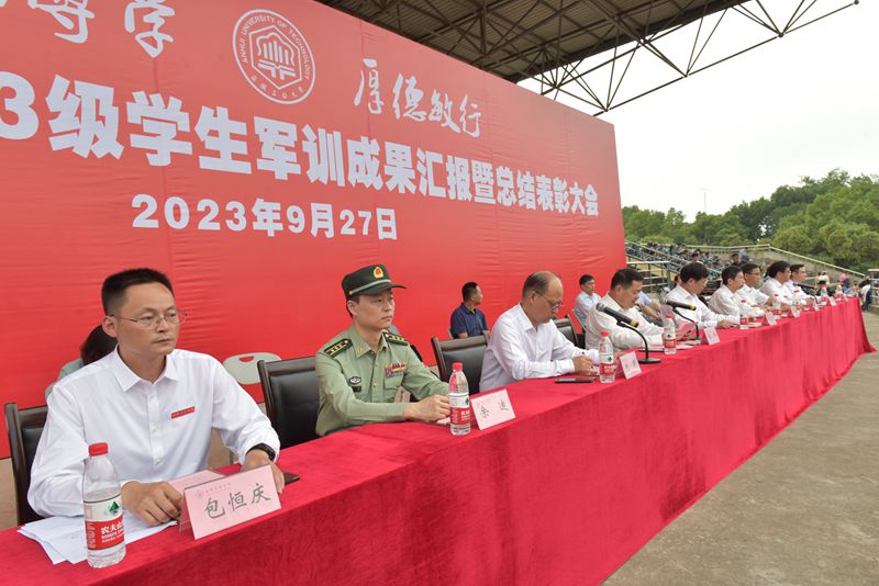 9月27日下午,我校在佳山校区田径场举行2023级学生军训成果汇报暨总结表彰大会。在校党政领导陆林、魏先文、刘明、水恒福,花山区人武部部长余迪出席。党办校办、宣传部、学生工作部、武装部、团委、教务处等部门负责人,各学院学生工作负责人、辅导员、承训教官和2023级参训新生参加。大会由校党委常委、副校长刘明主持。
