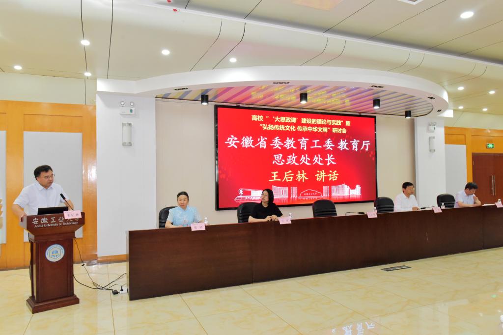 王后林代表省委教育工委、省教育厅,向本次研讨会的召开表示祝贺,对安徽工业大学“大思政课”建设成效给予肯定,对如何发挥好市域特色资源优势、进一步明确“大思政课”建设目标提出了指导意见。他指出,推进高校“大思政课”建设责任重大、使命光荣,要在视野上拓展“广度”、在资源上挖掘“深度”、在方法上提升“效度”,推动“大思政课”与中华优秀传统文化、中华文明探源成果深度融合、双向赋能,协同发力、久久为功。