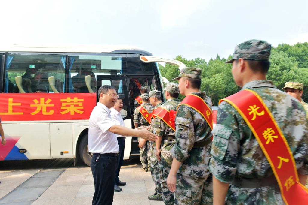 王俊介绍了我校2025年征兵工作的总体情况。36名预定新兵肩披“光荣入伍”绶带,与会领导为他们佩戴“光荣花”。预定新兵们满载全校师生的祝福与期望,步伐铿锵、意志坚定,有序登车启程。两名迷彩宣讲团学生高擎“欢送新兵”横幅昂扬前导,锣鼓声、欢呼声、掌声久久回荡。