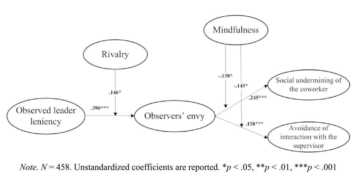 团队运用道义理论提出,员工会将领导宽容视为一种相对不公平,从而产生对同事的嫉妒情绪,进而将宽容行为的施予者和受惠者视为造成这种不利局面的责任人。出于道义反应,员工会通过在社交上排挤受青睐的同事以及避免与做出宽容行为的领导互动来做出回应。研究团队在此基础上进一步提出,观察者的竞争意识和正念会调节这些心理与行为反应。开展的两项研究(Study 1为实验室情景模拟实验,Study 2为两阶段实地追踪研究),进一步验证了以上研究模型与假设,即当员工观察到领导对同事表现出宽容时,可能会产生嫉妒情绪,进而引发对同事的“暗中破坏”和对领导的“刻意回避”;当员工竞争心理强且正念水平低时,对同事的社会破坏和对领导的互动回避行为达到顶峰。