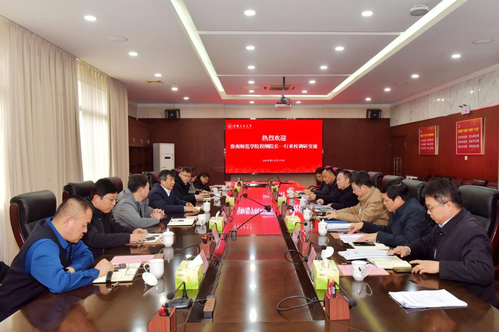 12月19日,淮南师范学院党委副书记、校长程刚,党委常委、副校长周晓宏一行来校调研交流。校党委副书记、校长曾杰,党委常委、副校长张世宏出席座谈会。淮南师范学院办公室、科研处、机电学院、教育学院、电子工程学院、化学与材料工程学院,以及我校党办校办、学科处、发规处、科研院等单位负责人参加座谈。会议由张世宏主持。