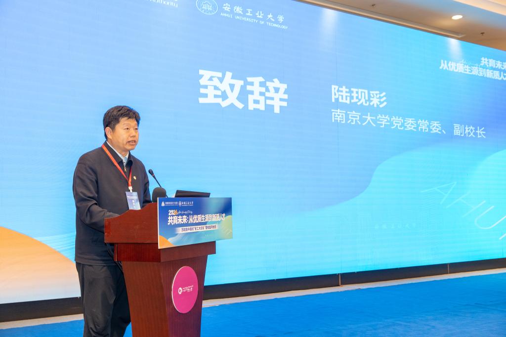 陆现彩代表南京大学对第四届苏皖高中高校“安工大论坛”的举办表示祝贺。他指出,苏皖山水相连、文脉相通,宁马城际开通为两地教育协同搭建了便捷通道,安徽工业大学作为南京大学重要战略合作伙伴,办学成果丰硕。立足“十五五” 开局与教育强国建设新征程,南京大学将聚焦基础前沿、贯通实践创新、深化区域协同,着力培养新质人才。期待与苏皖高中高校携手,深化人才早期培养、资源共享与学段贯通,为长三角一体化与教育强国建设贡献更大力量。