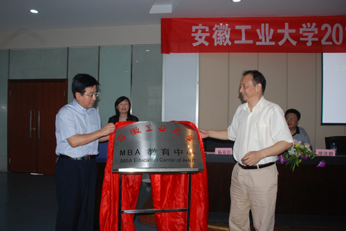 开学典礼在全体人员的国歌声中拉开了帷幕。岑豫皖校长和康承业董事长为安徽工业大学MBA教育中心揭牌。