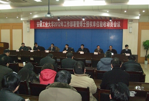 2月20日下午,安徽工业大学2012年工作部署暨博士授权单位验收动员会议在校学术会议中心二楼报告厅举行。会上,校党委书记兰玉杰作了重点工作暨博士授权单位验收动员讲话,校长李家新就2012年工作进行部署。副校长林钟高主持大会。校领导汪光阳、陈润、葛芦生、张国宝、魏先文出席大会。全校副处级以上干部,申博授权学科、支撑学科各学科方向带头人参加了会议。