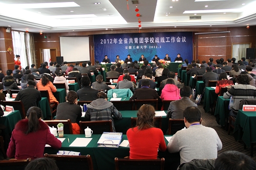 2月22日至24日,2012年全省共青团学校工作会议在我校召开。团省委副书记周密与来自全省115所高校团委、16个地市团委、省直属团工委的负责人以及我校全体团干近200名代表出席会议。马鞍山市委副书记訾金雷、校党委书记兰玉杰、校党委副书记汪光阳出席了全体会议和颁奖仪式。副校长魏先文在会议期间看望了与会代表。