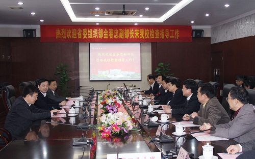 3月30日上午,省委组织部副部长金春忠在省委组织部企事业干部处处长张日升、省国资委企干处处长陈新陪同下来我校调研指导。校领导兰玉杰、李家新、汪光阳、张国宝、魏先文出席了调研座谈会。党办、组织部、宣传部、校办负责人参加了座谈会。座谈会由校长李家新主持。