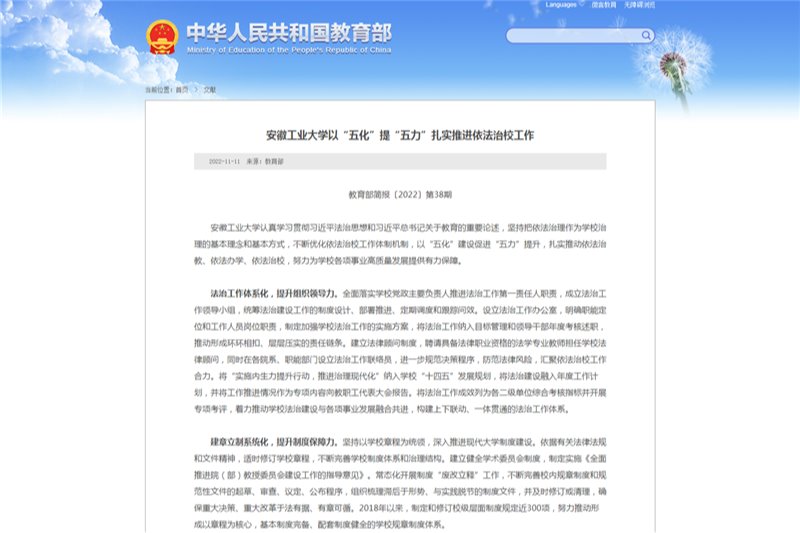 为深入学习贯彻习近平法治思想,全面贯彻落实党的二十大精神,坚持和完善中国特色社会主义教育制度体系,推进高等学校治理体系和治理能力现代化,进一步加强高等学校法治工作,全面推进依法治教、依法办学、依法治校,我校严格按照党中央、教育部、省委和省委教育工委的部署要求,高标准高质量开展依法治校示范校创建工作。11月11日,教育部简报2022年第38期以《安徽工业大学以“五化”提“五力”扎实推进依法治校工作》为题专...
